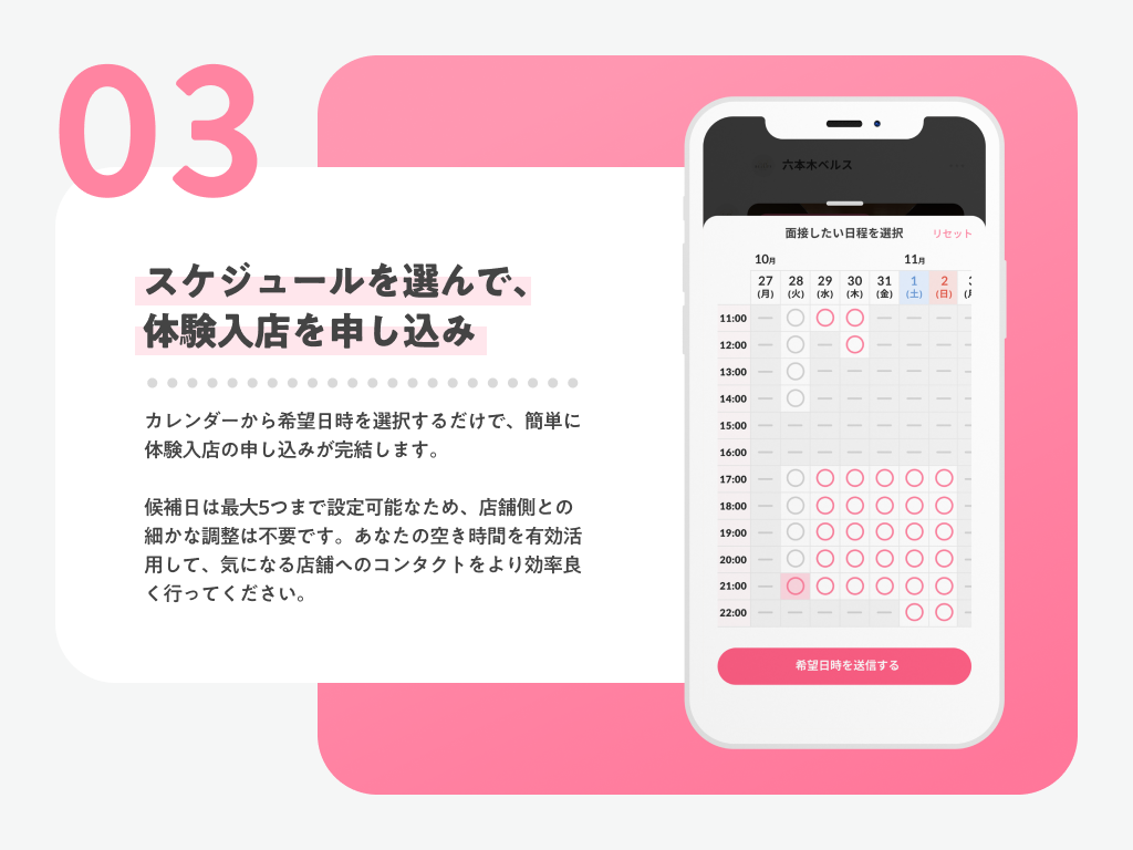 カレンダーから希望日時をタップして選ぶだけで、体験入店の申し込みが完了します。