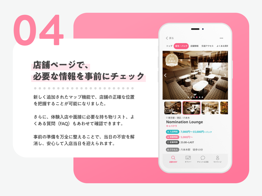新しく追加された「マップ機能」で店舗の正確な位置がすぐに把握できるほか、体験入店や面接に必要な「持ち物リスト」、気になる疑問を解決する「よくある質問(FAQ)」も確認できるようになっています。