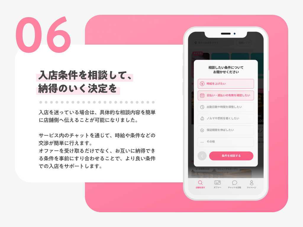サービス内のチャットを通じて、時給のアップや出勤日数の調整など、具体的な相談を店舗側へ簡単に伝えることができるようになりました。