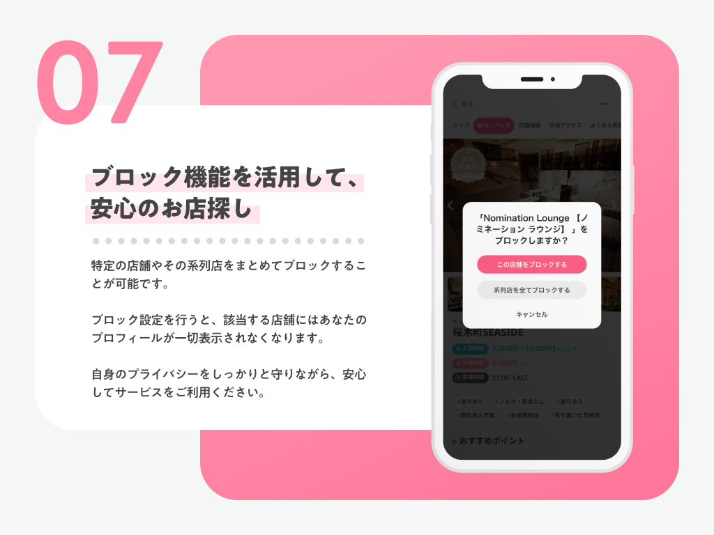 ブロックした店舗にはあなたのプロフィールが一切表示されなくなり、メッセージが届くこともありません。