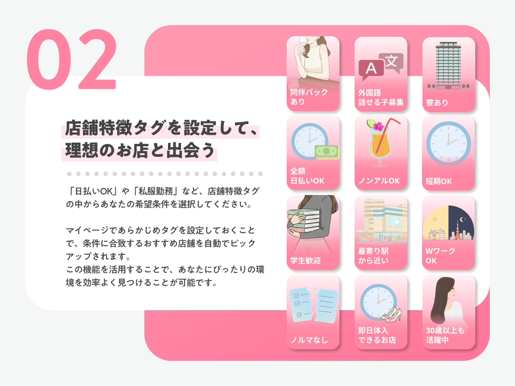 「日払いOK」「私服勤務」「ノルマなし」など、こだわりの条件を「店舗特徴タグ」として設定できるようになりました。